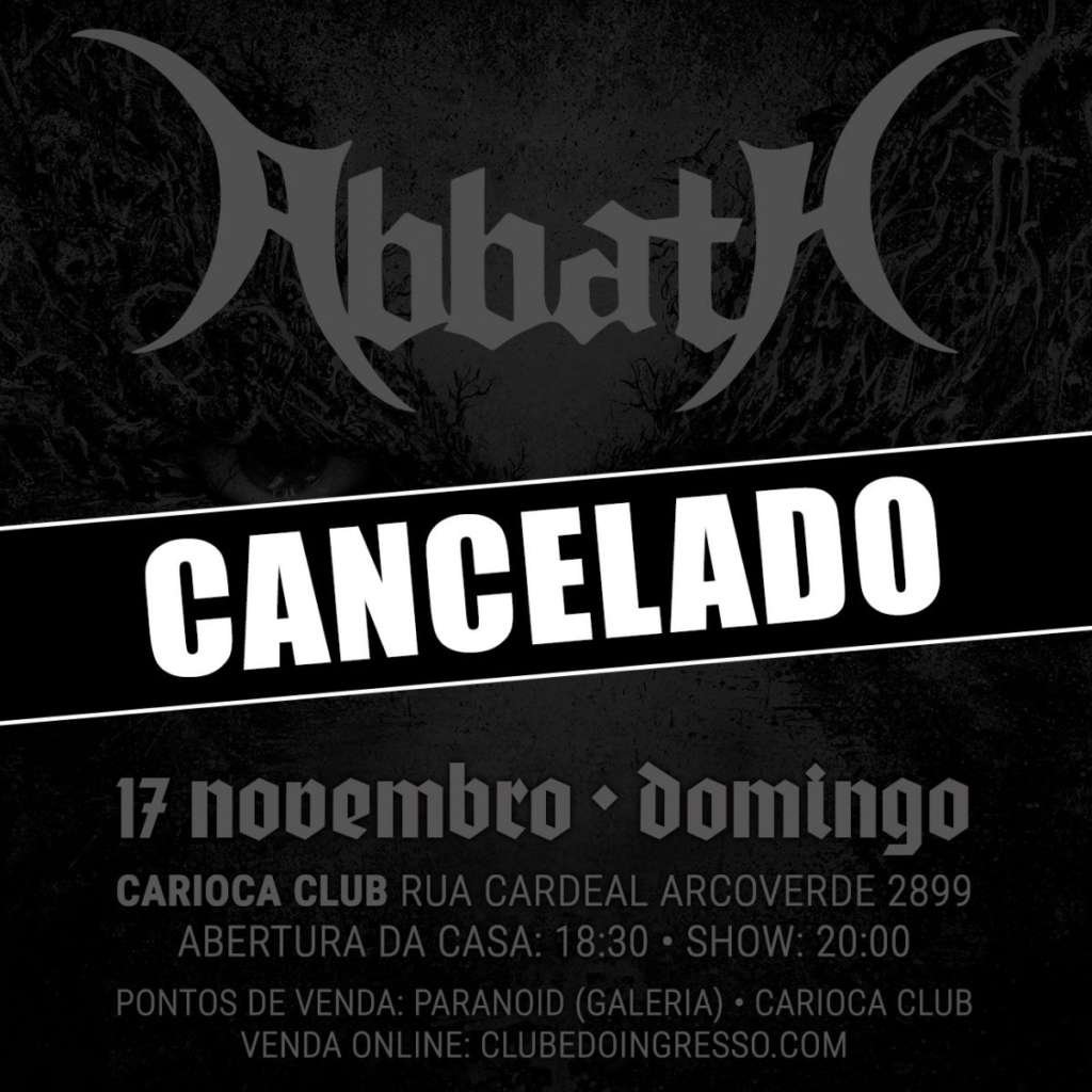 “A Overload lamenta comunicar o cancelamento da apresentação da banda norueguesa Abbath, que aconteceria neste domingo (17/11), no Carioca Club, em São Paulo, por motivos que fogem completamente ao controle da produtora.