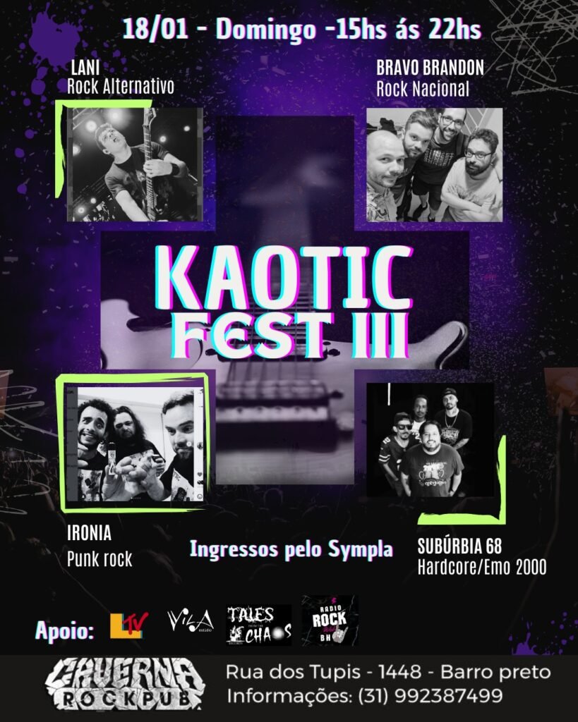 Além da performance de BETO LANI, o Kaotic Fest III traz um line-up diversificado que reforça a pluralidade do gênero. A banda Subúrbia 68 promete uma dose intensa de nostalgia e energia com o Hardcore e Emo dos anos 2000, mesclando faixas eletrizantes e clássicos que moldaram a banda. O Punk Rock ganha voz com a banda Ironia, que apresenta com seu humor característico as músicas do álbum de estreia “JCCDM”. Completando a grade, o grupo Bravo Brandon leva ao palco sua mistura singular de Rock, Reggae, baladas e psicodelia, temperada com o clássico toque de sofrência. Os ingressos para o festival já estão disponíveis pelo Sympla e o evento acontece das 15h às 22h, no Caverna Rock Pub, localizado na Rua dos Tupis, 1448, Belo Horizonte.
