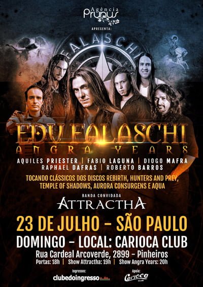 O renomado vocalista Edu Falaschi tem o prazer de anunciar show único e especial do projeto solo Angra Years em São Paulo, no Carioca Club, dia 23 de julho (domingo), com abertura da banda Attractha. Edu Falaschi volta aos tempos do Angra com seus amigos Aquiles Priester (Hangar, Tony Macalpine, Noturnall) e Fabio Laguna (Hangar) para recriar a magia dos álbuns “Rebirth”, “Hunters and Prey”, “Temple of Shadows”, “Aurora Consurgens” e “Aqua”. Os ingressos custam R$ 60,00 (pista) e R$ 100,00 (camarote) e estão à venda no site do Clube do Ingresso.