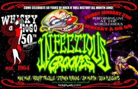 O line-up original do Infectious Grooves, com Mike Muir (Suicidal Tendencies), Robert Trujillo (Metallica), Stephen Perkins (Janes’s Addiction), Dean Pleasants (Suicidal Tendencies) e Jim Martin (ex-Faith No More) no lugar do guitarrista Adam Siegel, se reuniu para uma apresentação na última sexta-feira (31 de janeiro), no Whisky A Go Go. A performance do grupo marcou o encerramento dos festejos pelos 50 anos da lendária casa de shows localizada em Hollywood, Califórnia, cuja programação ocorreu ao longo de todo o mês passado.