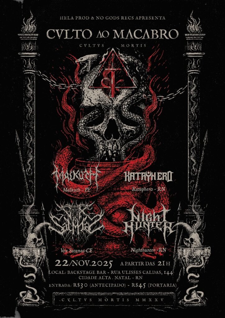 A banda potiguar Kataphero confirma presença no evento “Cvlto ao Macabro – Cvltvs Mortis”, que acontece no dia 22 de novembro, no Backstage Bar, em Natal/RN. O festival reunirá expoentes do Metal extremo nordestino, entre eles Malkuth (PE), Vox Satanas (CE) e Nighthunter (RN).