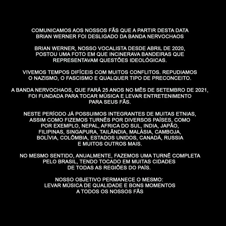 Comunicamos aos nossos fãs que a partir desta data Brian Werner foi desligado da banda NervoChaos