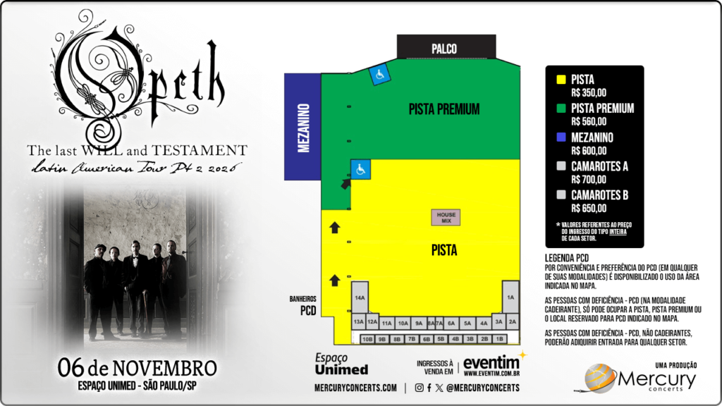 Com produção da Mercury Concerts, a turnê promove The Last Will & Testament, o 14º álbum de estúdio do Opeth e um dos trabalhos mais ambiciosos e impactantes de sua carreira. Considerado o disco mais sombrio e pesado da banda em décadas, o álbum também é o mais ousadamente progressivo, reafirmando o Opeth como um dos nomes mais inovadores da música pesada contemporânea.