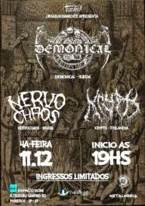 Os suecos da banda Demonical se apresentam em São Paulo nesta quarta, ao lado das bandas NervoChaos e Krypts (Finlândia). O show acontece no Espaço Som (Rua Teodoro Sampaio, 512, São Paulo – próximo ao metrô Clínicas). Os ingressos custam apenas R$40 e os ingressos são limitados. O show começa a partir das 19h – e vai até as 23h.